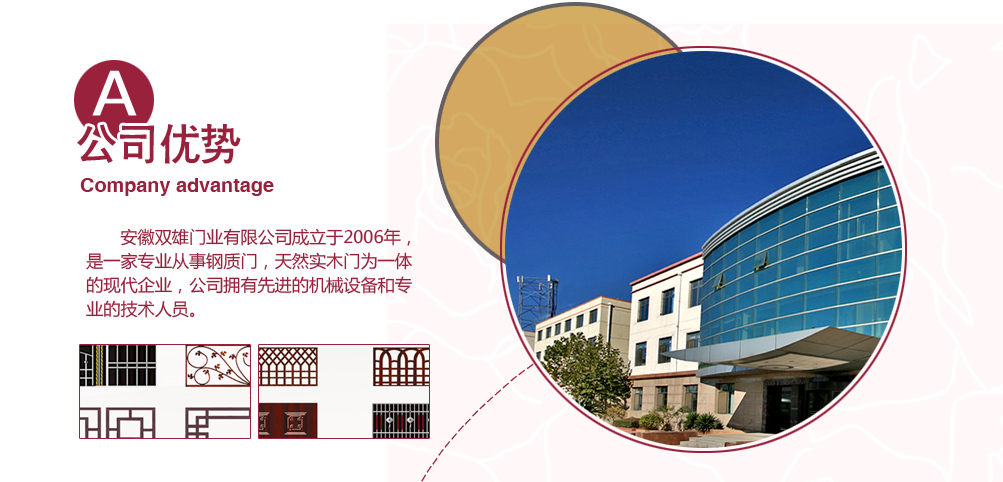 安徽六安雙雄門(mén)業(yè)有限公司成立于2006年,是一家專業(yè)從事鋼質(zhì)門(mén),天然實(shí)木門(mén)為一體的現(xiàn)代企業(yè),公司擁有先進(jìn)的機(jī)械設(shè)備和專業(yè)的技術(shù)人員,以科技為依托,以市場(chǎng)需求為導(dǎo)向,大膽創(chuàng)新追求更好,全身致力于提高門(mén)業(yè)裝飾水平。公司擁有先進(jìn)的機(jī)械設(shè)備和專業(yè)的技術(shù)人員,以科技為依托,以市場(chǎng)需求為導(dǎo)向,全力打造“雙雄”品牌門(mén)!產(chǎn)品種類繁多:金屬門(mén)(棗紅金屬門(mén)、黑底金屬門(mén));仿銅門(mén)(紅銅門(mén)、紫銅門(mén));真銅門(mén)(仿真銅門(mén)、真紫銅門(mén));不銹鋼門(mén)等。公司依靠雄厚的技術(shù)力量,先進(jìn)的設(shè)備,現(xiàn)代化的管理,全力打造“雙雄”品牌,以“精益求精”“服務(wù)為先”為經(jīng)營(yíng)理念,以“專業(yè)、誠(chéng)信、熱情、周到”為服務(wù)宗旨,在消費(fèi)者中已樹(shù)起良好企業(yè)形象。