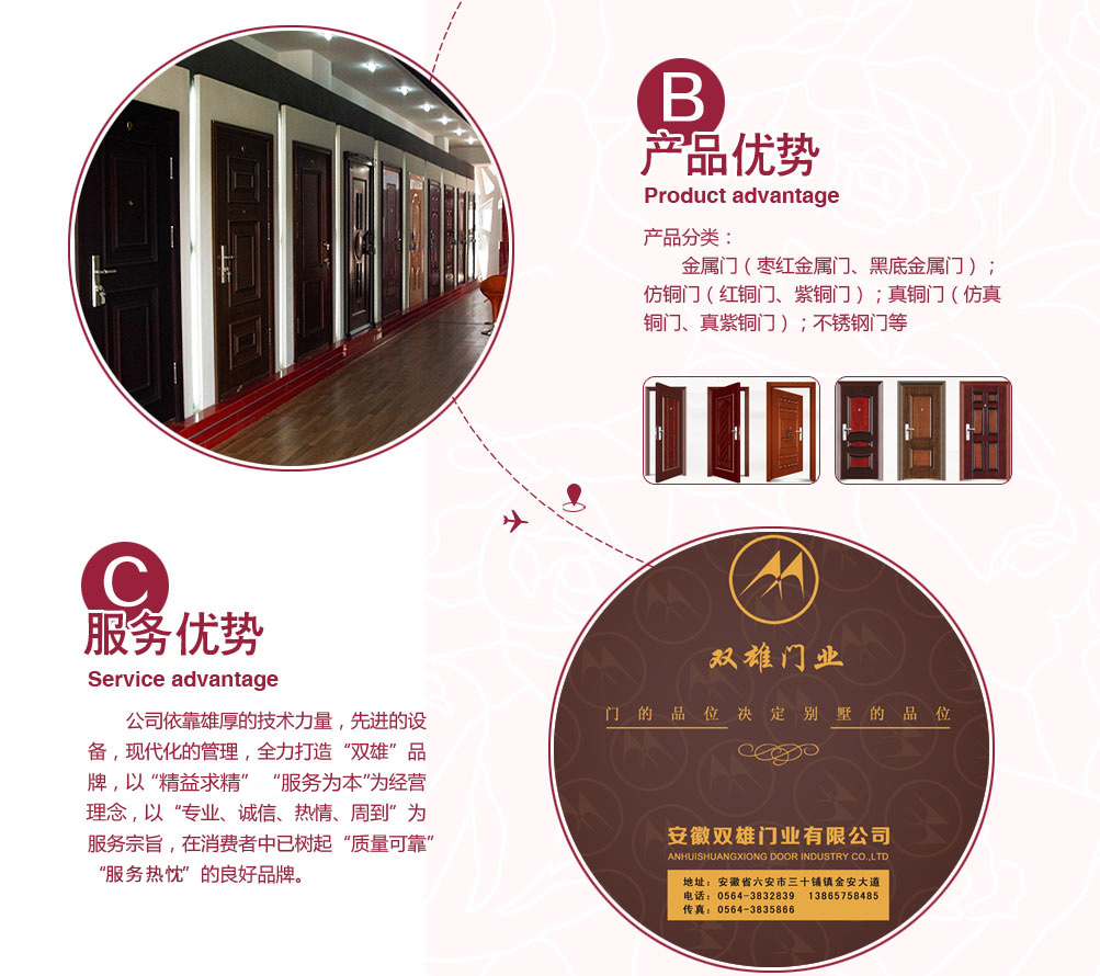 安徽六安雙雄門(mén)業(yè)有限公司成立于2006年,是一家專業(yè)從事鋼質(zhì)門(mén),天然實(shí)木門(mén)為一體的現(xiàn)代企業(yè),公司擁有先進(jìn)的機(jī)械設(shè)備和專業(yè)的技術(shù)人員,以科技為依托,以市場(chǎng)需求為導(dǎo)向,大膽創(chuàng)新追求更好,全身致力于提高門(mén)業(yè)裝飾水平。公司擁有先進(jìn)的機(jī)械設(shè)備和專業(yè)的技術(shù)人員,以科技為依托,以市場(chǎng)需求為導(dǎo)向,全力打造“雙雄”品牌門(mén)!產(chǎn)品種類繁多:金屬門(mén)(棗紅金屬門(mén)、黑底金屬門(mén));仿銅門(mén)(紅銅門(mén)、紫銅門(mén));真銅門(mén)(仿真銅門(mén)、真紫銅門(mén));不銹鋼門(mén)等。公司依靠雄厚的技術(shù)力量,先進(jìn)的設(shè)備,現(xiàn)代化的管理,全力打造“雙雄”品牌,以“精益求精”“服務(wù)為先”為經(jīng)營(yíng)理念,以“專業(yè)、誠(chéng)信、熱情、周到”為服務(wù)宗旨,在消費(fèi)者中已樹(shù)起良好企業(yè)形象。
